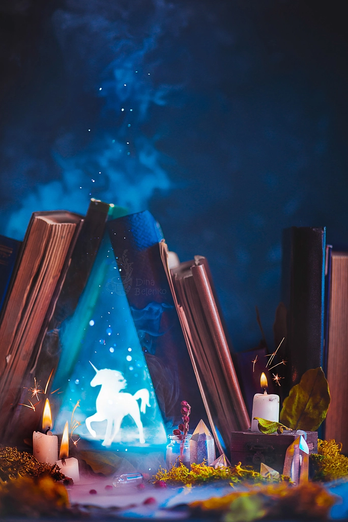 Without a lot props, my imagination gets to fill in the blanks! I can make a dragon with a piece of tracing paper, create a galaxy around a donut, or even invite a tiny unicorn to live on my bookshelf. With just two speedlights and a reflector, I can tell stories of outer space, magical potions, travelers, scientists, and wizards. The most interesting part is creating a fairy tale concept—all the technicalities are just algebra homework.